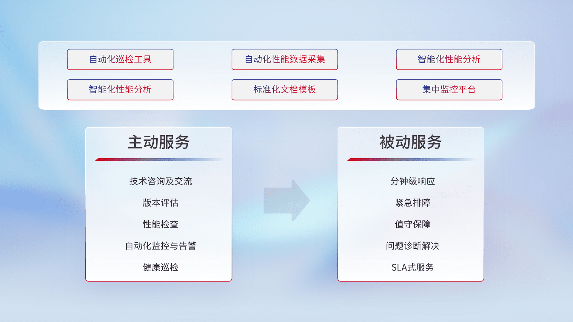 智能化工具和标准化文档,,,,保障服务质量,,,,提供主动服务(包含技术咨询、、、版本评估、、性能检查、、、、自动化监控与告警、、、、健康巡检)和被动服务包含(分钟级响应、、紧急排障、、值守保障、、、问题诊断解决、、、SLA服务)。。。。