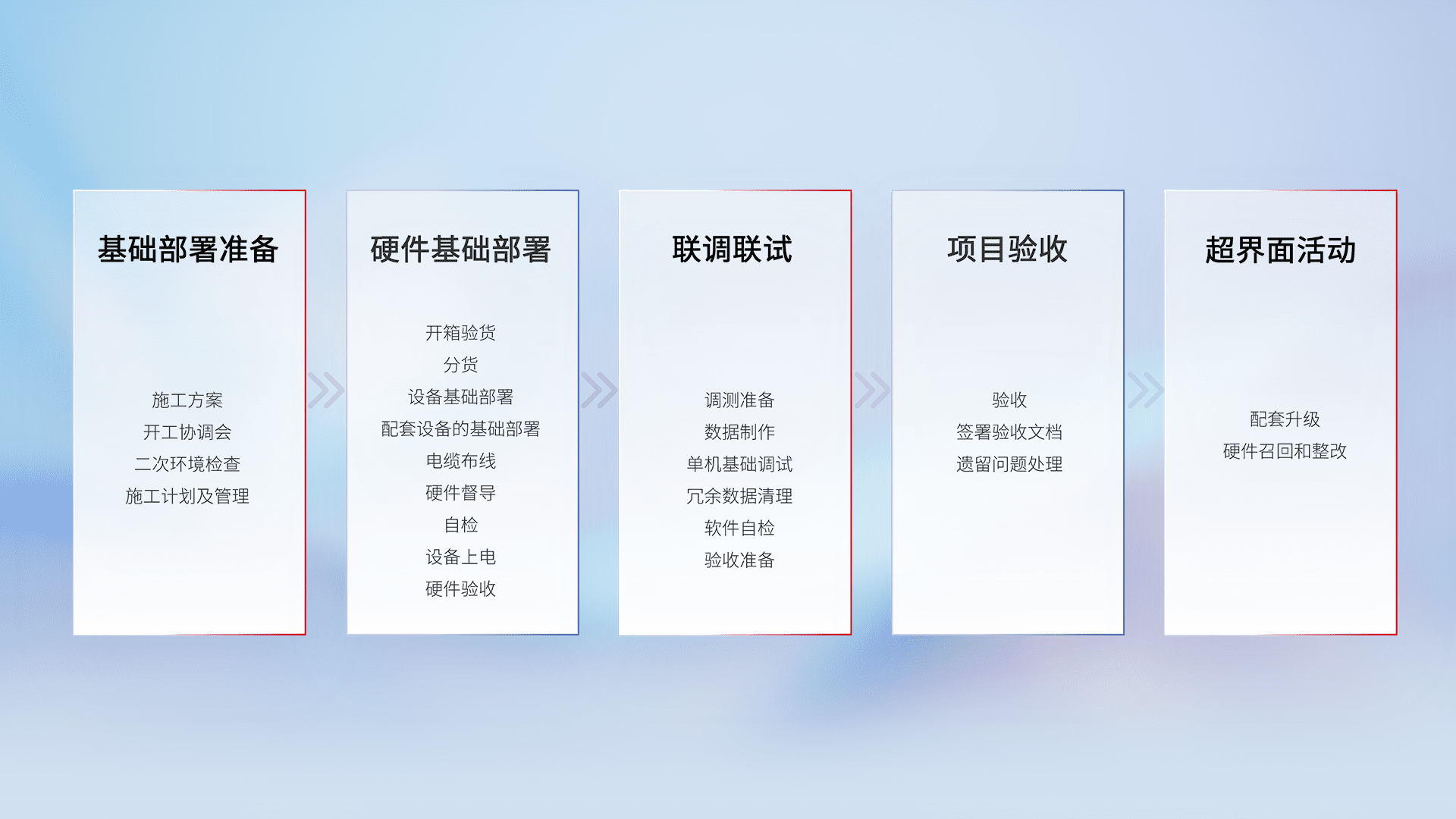 从基础部署准备、、、硬件基础部署、、、联调联试、、项目验收、、越界面活动的全过程可追溯,,,,保证施工质量和进度。。。